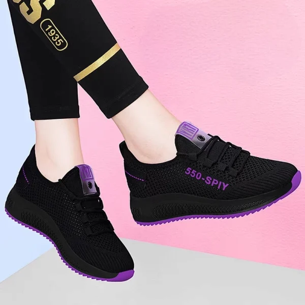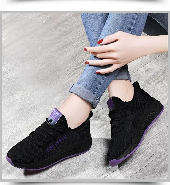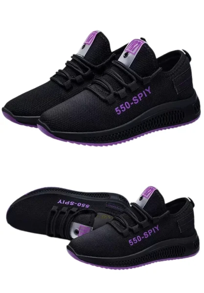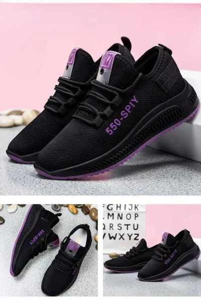 الحذاء النسائي باللون الاسود مع تفاصيل بنفسجي . يوجد عليه كلمة "550-SPY" على الجانب. التصميم العام للحذاء رياضي وعصري، مما يجعله مناسباً للأنشطة اليومية والمشي.### تفاصيل الحذاء:- **الجزء العلوي**: مصنوع من نسيج محبوك.- **الداخلية**: مبطنة بملمس حريري مريح.- **النعل**: مصنوع من المطاط، مما يوفر مرونة وراحة أثناء الحركة.- **اللون**: يتوفر بثلاث الوان ، الأسود مع الأحمر، والأسود مع البنفسجي والابيض مع الاحمر .### مواصفات الحذاء:1. **ارتفاع الكعب**: 3 سم2. **ارتفاع الجزء العلوي**: 8 سم3. **محيط الحذاء**: 13 سم4. **منصة مقاومة للماء**: 1 سم5. **طول الحذاء**: 23 سم### مقاس الحذاء (بالسنتمترات):- **مقاس 34**: 21.6-22 سم- **مقاس 35**: 22.1-22.5 سم- **مقاس 36**: 22.6-23 سم- **مقاس 37**: 23.1-23.5 سم- **مقاس 38**: 23.6-24 سم- **مقاس 39**: 24.1-24.5 سم### متى يتم ارتداء هذا الحذاء:- **للأنشطة اليومية**: مثل التسوق أو المشي لمسافات طويلة.- **للرياضة**: بفضل تصميمه المريح والداعم.- **للمناسبات غير الرسمية**: حيث يجمع بين الأناقة والراحة."حذاء رياضي نسائي بألوان جريئة وتصميم عصري."