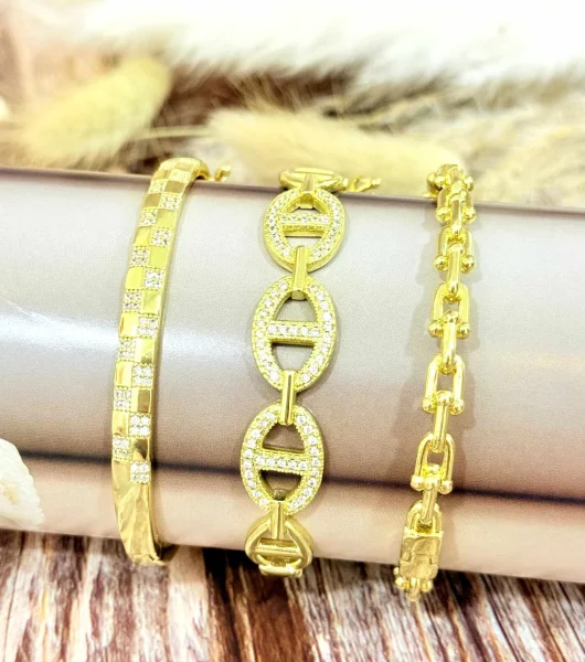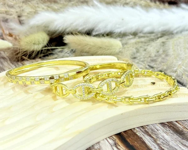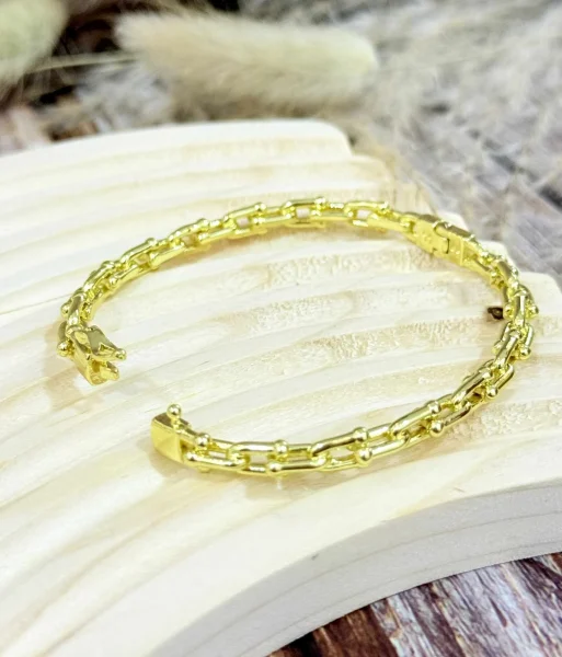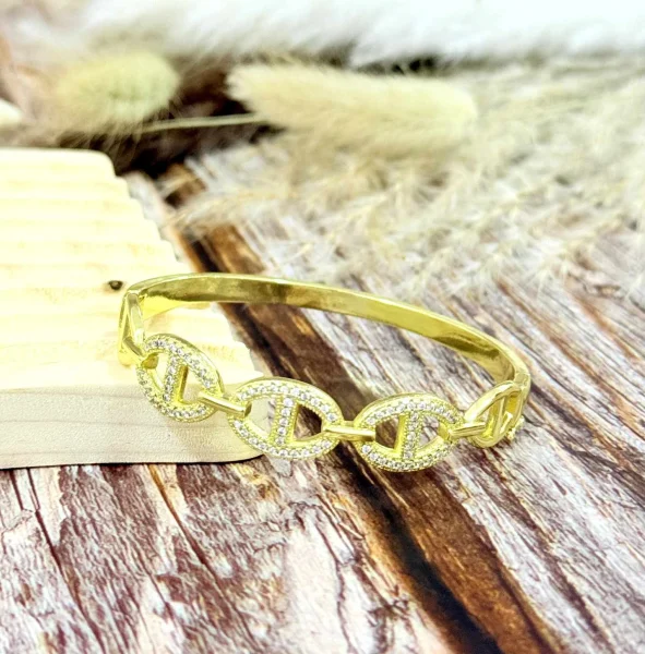 سوار ذهبي بتصميم أنيق يعكس الفخامة والتفرد،مصنوع بحرفية عالية ومزين بتفاصيل دقيقة ليضيف لمسة راقية إلى إطلالتك.مثالي للمناسبات الخاصة والاستخدام اليومي.