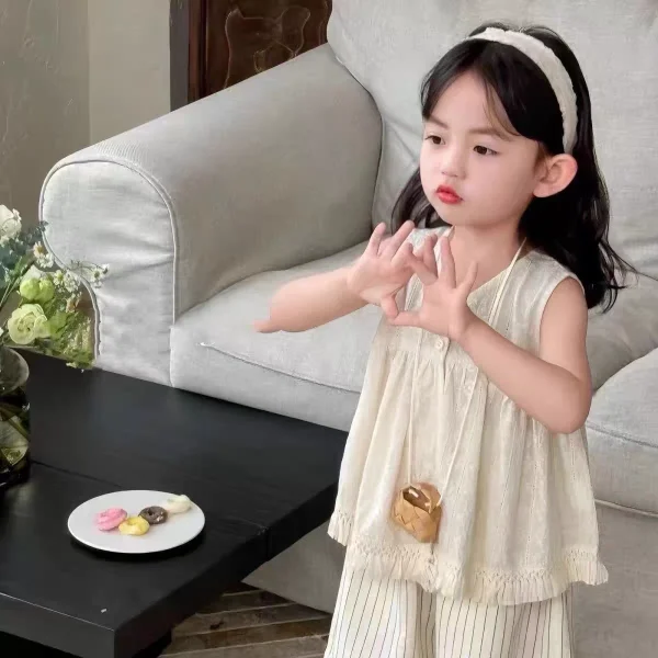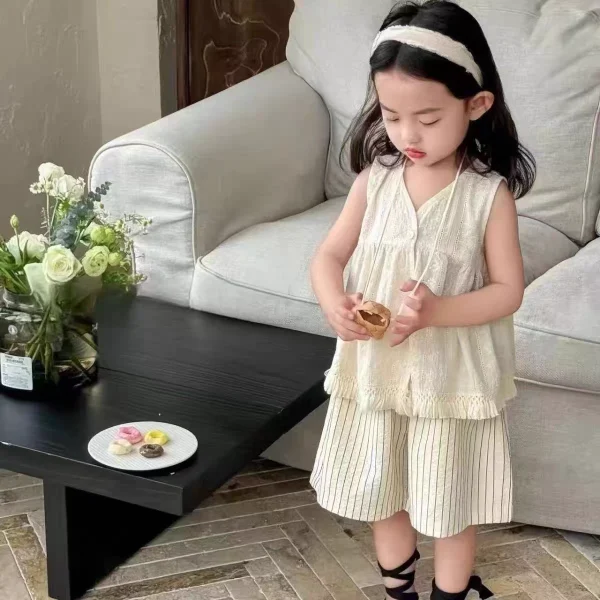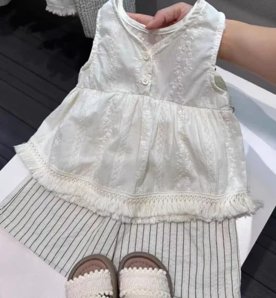 طقم صيفي انيقا يتكون بلوزه بيضاء بدون اكمام مزينه بحواف متموجهمع تنوره قصيرة ذات خطوط عمودية دقيقه تضفي طابعا كلاسيكي انيق