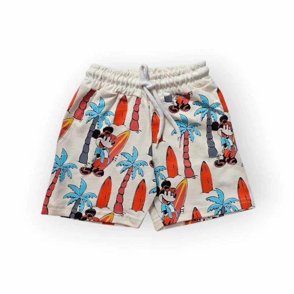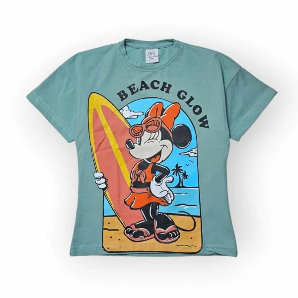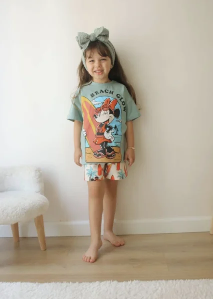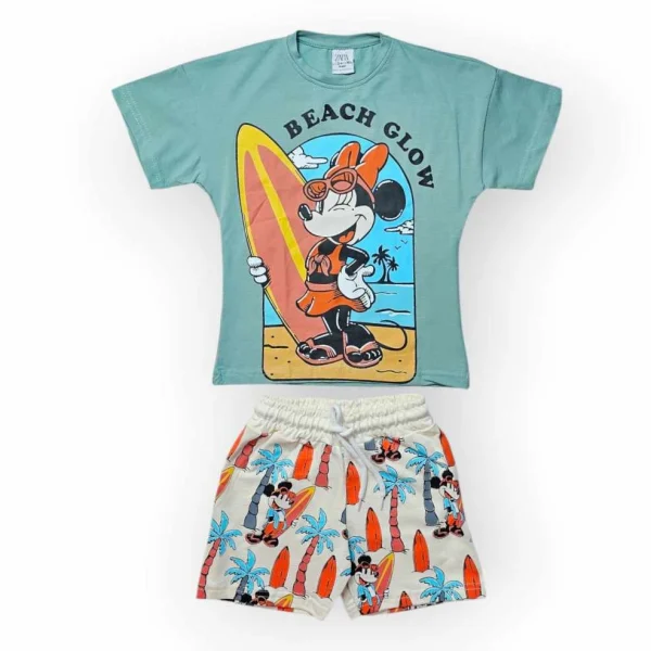 بدلة قطنية مكونة من تيشيرت بأكمام قصيرة وسروال قصير. التيشيرت بلون أخضر فاتح وعليه طباعة لشخصية كرتونية تحمل لوح تزلج على الشاطئ، مع عبارة "BEACH GLOW" في الأعلى. أما السروال فهو بلون فاتح، مزين برسومات متكررة لنفس الشخصية الكرتونية، مع أشجار النخيل وألواح التزلج، مما يمنحه طابعًا صيفيًا مريحًا ومناسبًا للأجواء الحارة. التصميم يعكس أجواء المرح والعطلة الصيفية، والبدلة مصنوعة من قماش قطني خفيف يمنح الراحة والتهوية الجيدة.