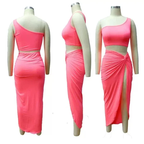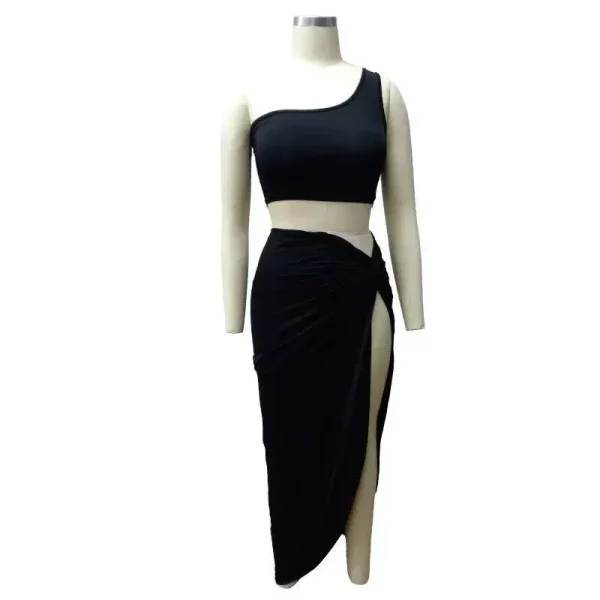 الطقم  الأنيق المكون من قطعتين،يتميز بتصميمه العصري والجريء. البلوزة القصيرة ذات الكتف الواحد تضفي لمسة من الأناقة العصرية،بينما التنورة بخصر عالي وشق طويل من جانب واحد تضيف جاذبية وأناقة. التصميم غير المتناظر وقصّة الشق الدراماتيكي يبرزان جمال القوام بشكل رائع.: يمكن ارتداء هذا الطقم في المناسبات الخاصة، السهرات المسائية، أو الحفلات الرسمية.إطلالة راقية للمناسبات المميزة".