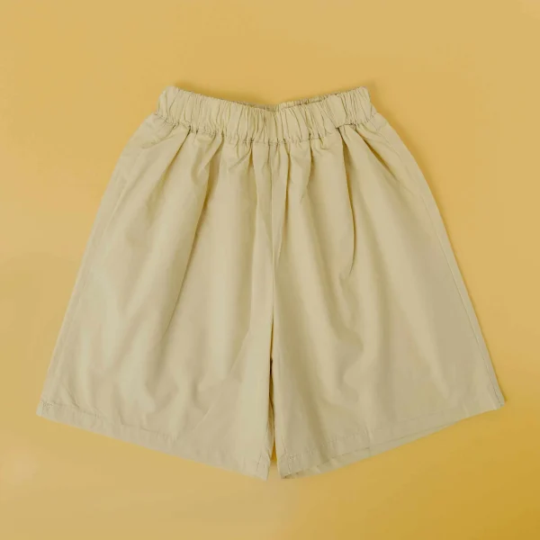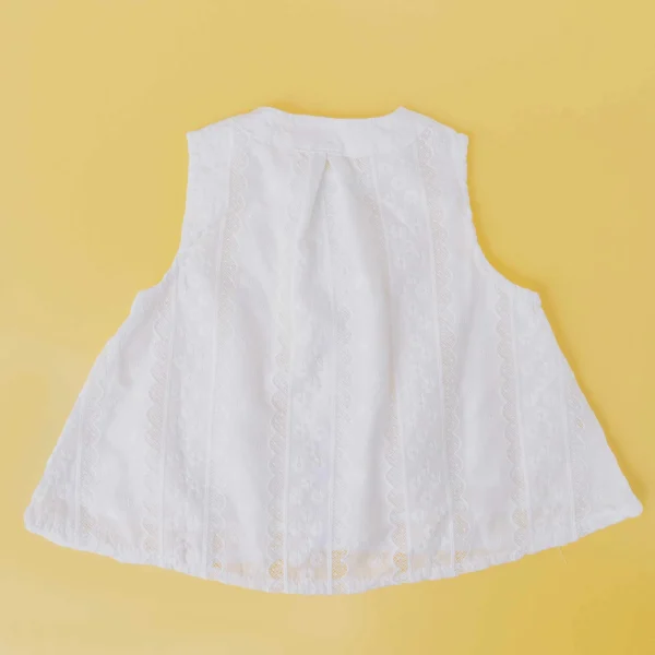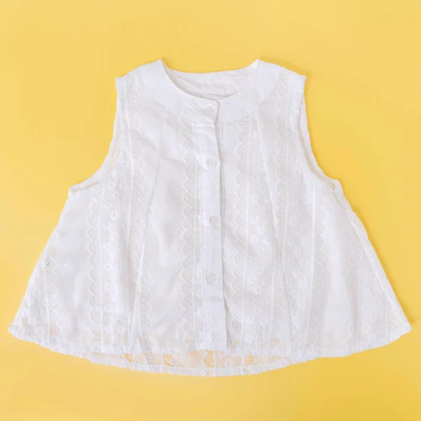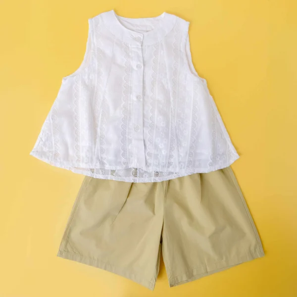 بدله بناتي مكونه من قطعتين انيقتينالقطعه العلويه هي بلوزة بيضاء بدون اكمام مزخرفه بالدانتيل الرقيقوتحتوي على ازرار في المقدمهالقطعه السفليه هي شورت بلون بيج فاتح يتناسق تماما مع البلوزة