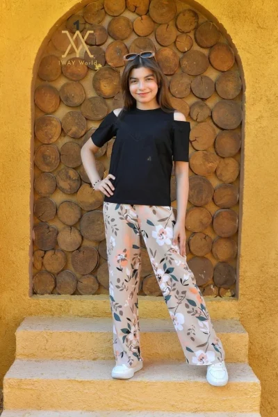 الطقم يتكوّن من بلوزة قصيرة بأكمام ناعمة مزينة بفتحات عند الكتفين، مع بنطلون واسع بنقشة زهرية تضيف لمسة حيوية وخفيفة للمظهر. القماش يبدو مريحًا وعمليًا، مما يجعل الطقم مناسبًا للاستخدام اليومي.يُعتبر هذا التصميم من القطع متعددة الاستخدام—فهو يدمج بين راحة الملابس المنزلية وأناقة القطع الكاجوال، ما يجعله ملائمًا كخيار خروج غير رسمي أو جلسات عائليةالقماش: التيشرت قطن سنجل ليكرا قطن100%البنطلون: فريسكا مقلم مطبوع