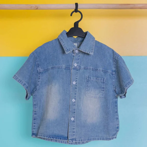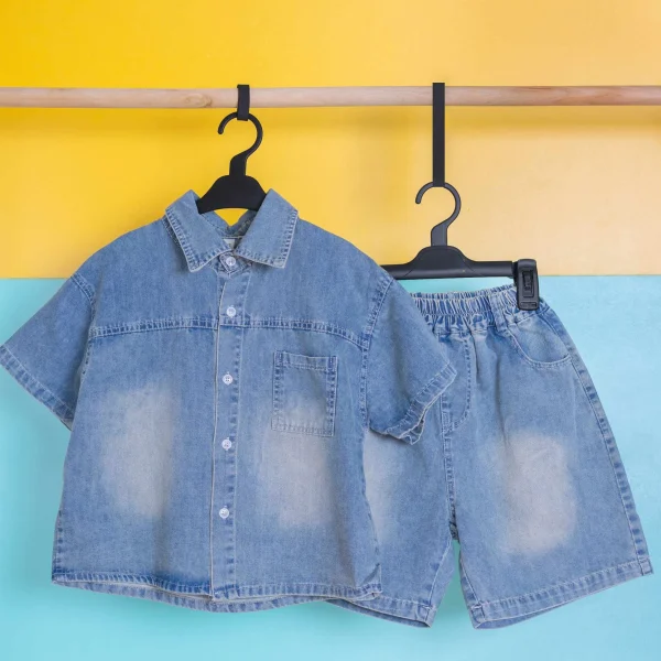 طقم ولادي مكون من قطعتينالطقم مصنوع من قماش الجينز يتكون من قميص بازارا وجيب صغير عند الصدر وشورت جينز بجيوب جانبيه جميل وانيق بتصميم عصري ملائم للمناسبات والبس لليومي