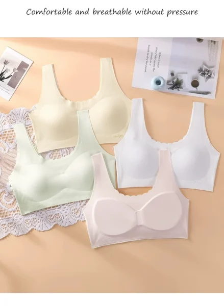 المنتج عبارة عن مجموعة من حمالات الصدر المريحة والقابلة للتنفس بدون ضغط.حمالات صدر بألوان مختلفة: بيج فاتح، أخضر فاتح، أبيض، ووردي فاتح.الحمالات مصممة بدون أسلاك وتبدو ناعمة ومريحة. مما يعني أنها مريحة وقابلة للتنفس بدون ضغط.الطقم حبتين ترسل للعميل بالوان عشوائيهحمالات الصدر المريحة والقابلة للتنفس، توفر مجموعة من المزايا العامة التي تجعلها اختيارًا شائعًا للكثيرين:1. **راحة فائقة:** مصنوعة من مواد ناعمة ومرنة توفر راحة طوال اليوم بدون ضغط زائد.2. **قابلية للتنفس:** تتيح التهوية الجيدة مما يساعد على الحفاظ على الشعور بالانتعاش والجفاف.3. **تصميم بدون أسلاك:** تقلل من الشعور بالضيق أو الانزعاج الناتج عن الأسلاك التقليدية.4. **دعم جيد:** توفر دعمًا كافيًا للصدر على الرغم من عدم وجود أسلاك.5. **سهولة العناية:** غالبًا ما تكون سهلة الغسيل والعناية، مما يجعلها ملائمة للاستخدام اليومي.6. **تنوع في الألوان والتصاميم:** تتوفر بمجموعة متنوعة من الألوان والتصاميم التي تناسب مختلف الأذواق والاحتياجات.7. **ملائمة للنشاطات المختلفة:** يمكن ارتداؤها أثناء الأنشطة اليومية أو عند ممارسة الرياضة الخفيفة.هذه المزايا تجعل هذه المنتجات خيارًا ممتازًا للباحثين عن الراحة والدعم في نفس الوقت.