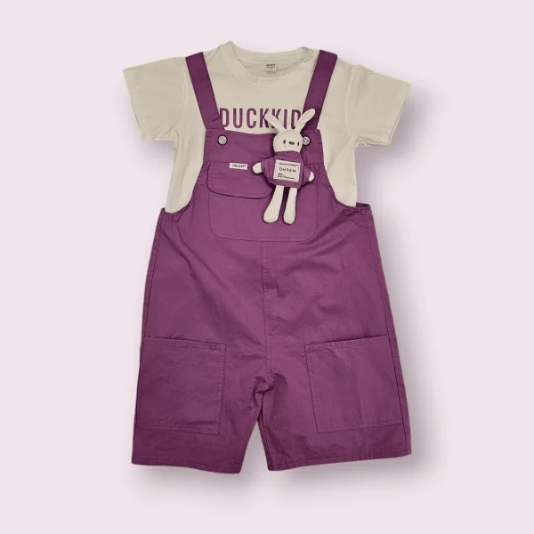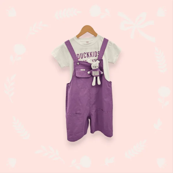 بدله بناتي مكونه من قطعتين جميله ومريحه للطفل اثناء الرحلات الخارجيه والمناسبات تأتي بتيشرت ابيض وبنطلون علاق باللون الموف مع دبدوب صغيرالقماش : كتان +قطن