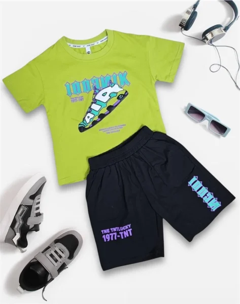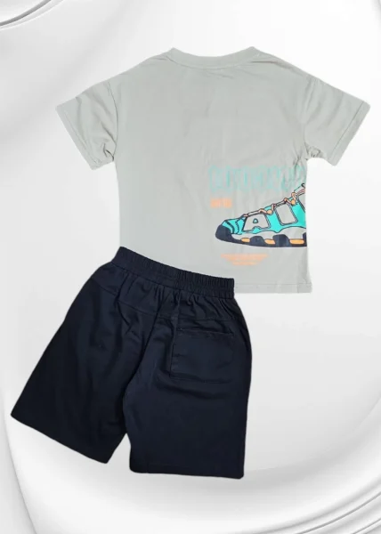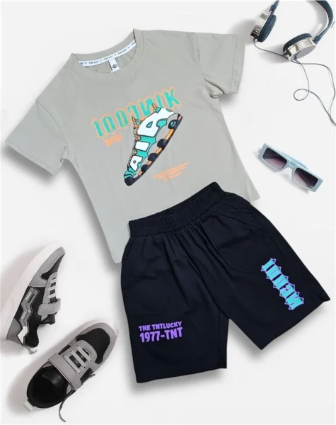 الطقم يتكون من قميص وسروال قصير،يتميز القميص برسمة حذاء رياضي وكلمات مكتوبة بخط كبير.السروال القصير يحتوي أيضًا على كلمات مكتوبة بخط كبير على الجانبين.مناسب للأنشطة الرياضية والترفيهية،مثالي للأيام الحارة والمناسبات غير الرسمية."