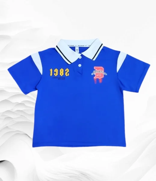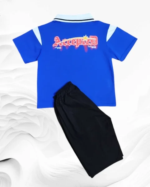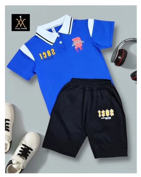 الطقم يتكون من قميص بولو أزرق وسروال قصير أسود.القميص مزين بشعار "Attabia" ورقم "1982" على الصدر.السروال يحتوي على نفس الرقم وعبارة "TREND LEADER". مناسب للصيف ومناسب للمناسبات والتنزه