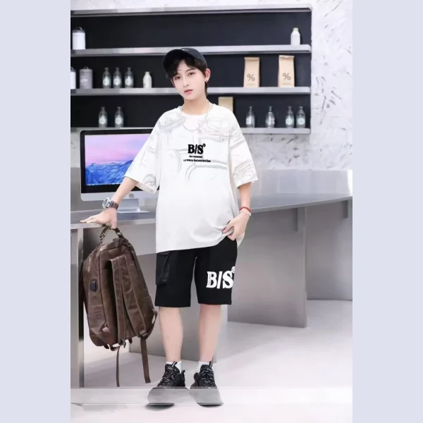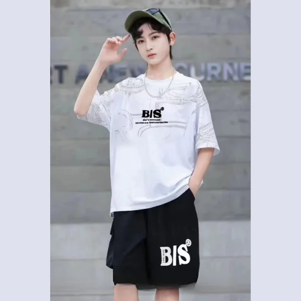 طقم رائع للأولاد مكون من قطعتين تيشرت منخفض الاكتاف و شورت مريح وعملي هذا الطقم يضفي اناقه لامثيل لها لابنكالقماش :قطن