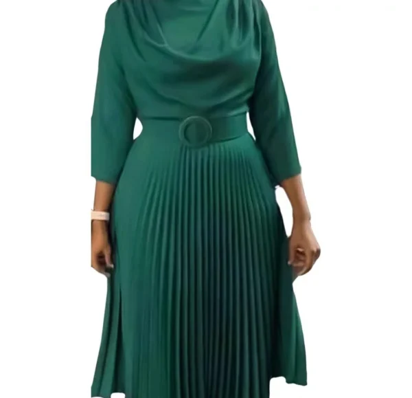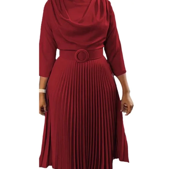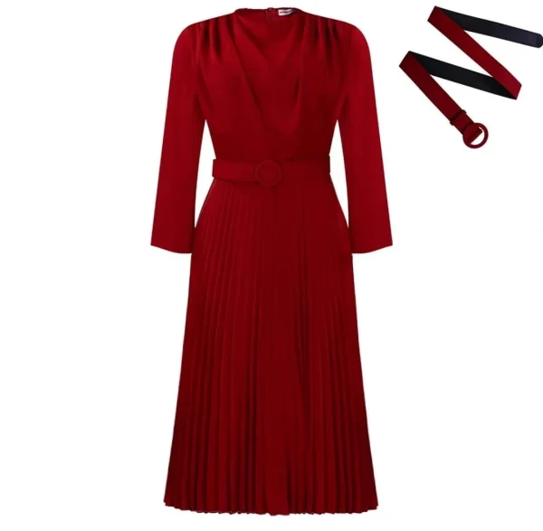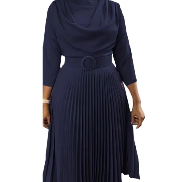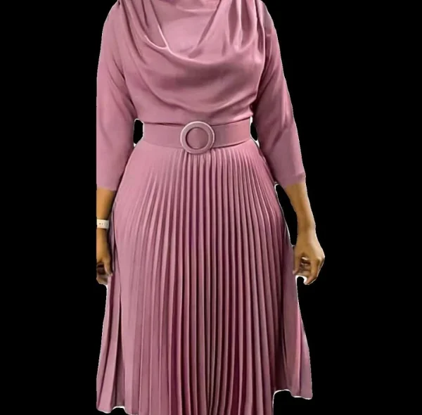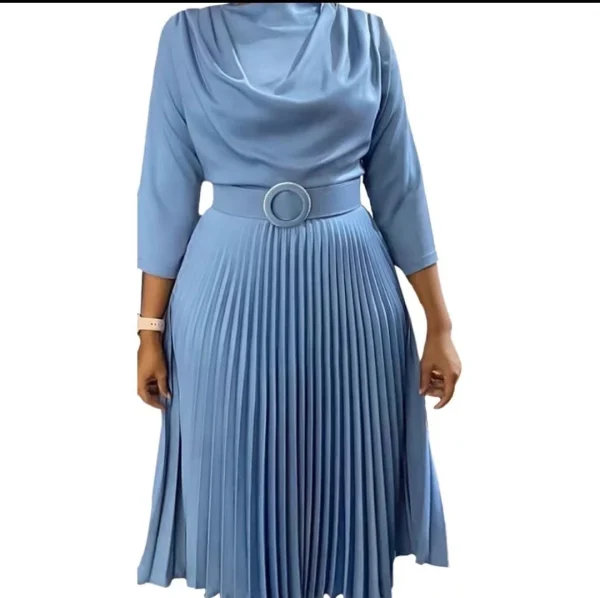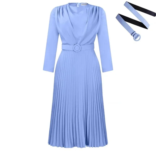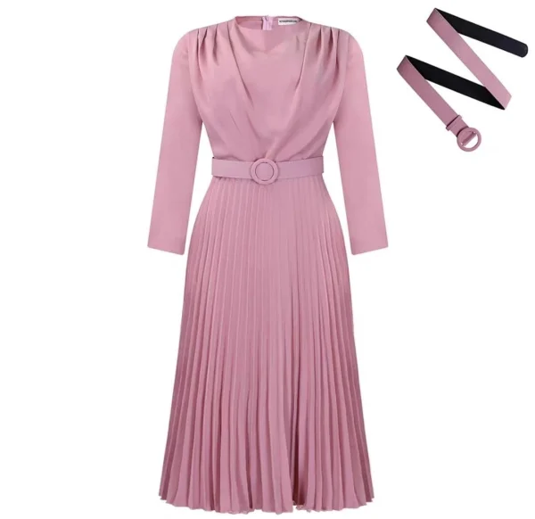 فستان يتميز بتصميم أنيق وأنثوي .حيث يأتي بألوان ناعمه وجذابه.يتميز بأكمام طويلة وقصة محتشمه مع ياقة ذات ثنيات تضيف لمسة كلاسيكية.الخصر مزود بحزام بنفس لون الفستان مع مشبك دائري مايساعد على ابراز شكل الجسم.القماش:بوليستر الجزء السفلي من الفستان يتميز بقماش مطوي (بليسيه)مما يضيف إليه حركة وانسيابية جذابهالطول متوسط حيث يصل إلى منتصف الساق ممايجعله مناسبا للمناسبات المختلفة سواء الرسمية أو الكاجوال الأنيق.